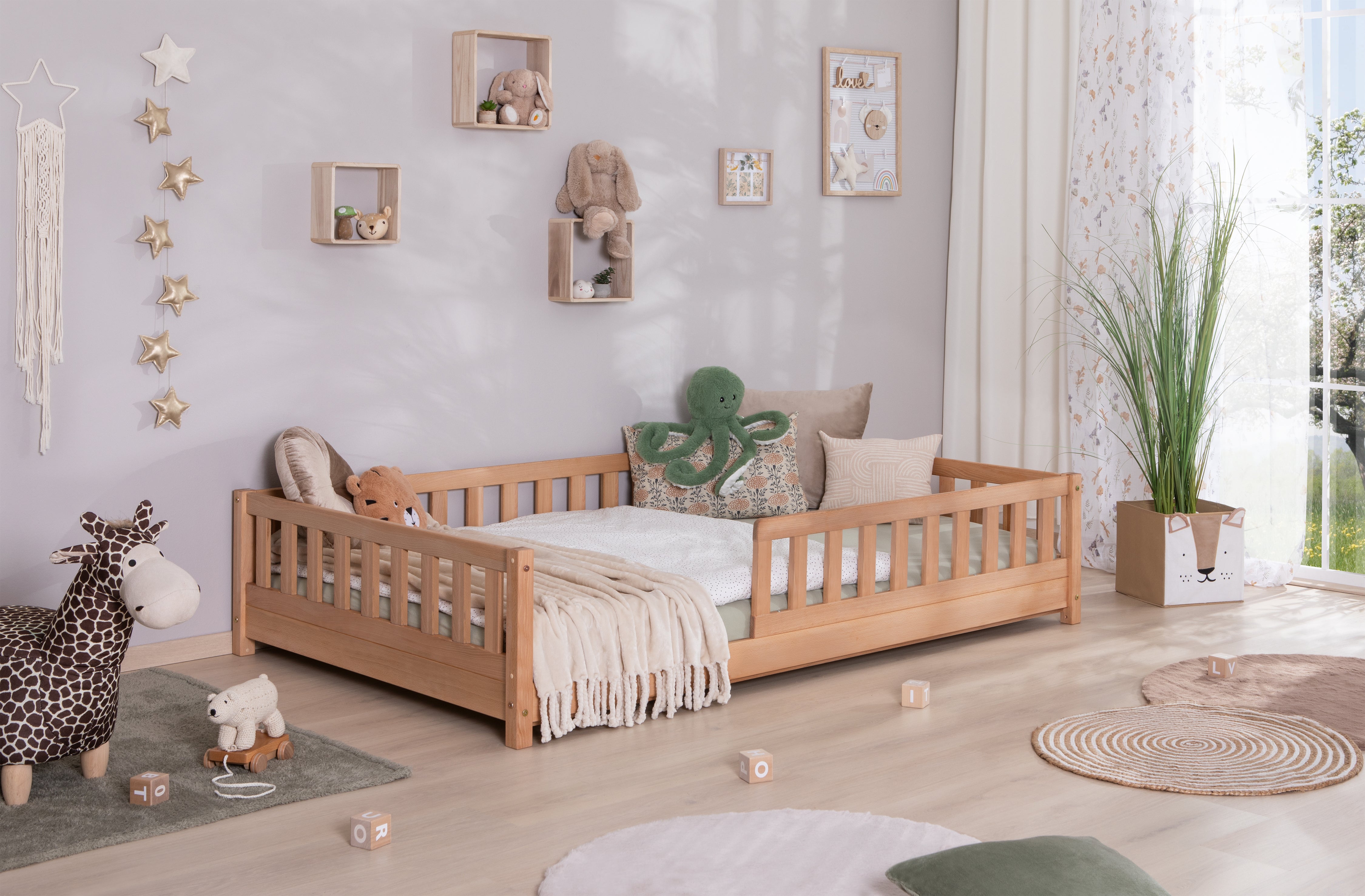 Der mitgelieferte Rausfallschutz gibt besonders in den ersten Jahren ein beruhigendes Gefühl – für Eltern ebenso wie für Kinder. Er lässt sich flexibel rechts oder links montieren und kann später problemlos entfernt werden, sobald dein Kind ruhig und eigenständig schläft. Für ein rundum gutes Gefühl wurden außerdem alle Kanten sorgfältig abgerundet.