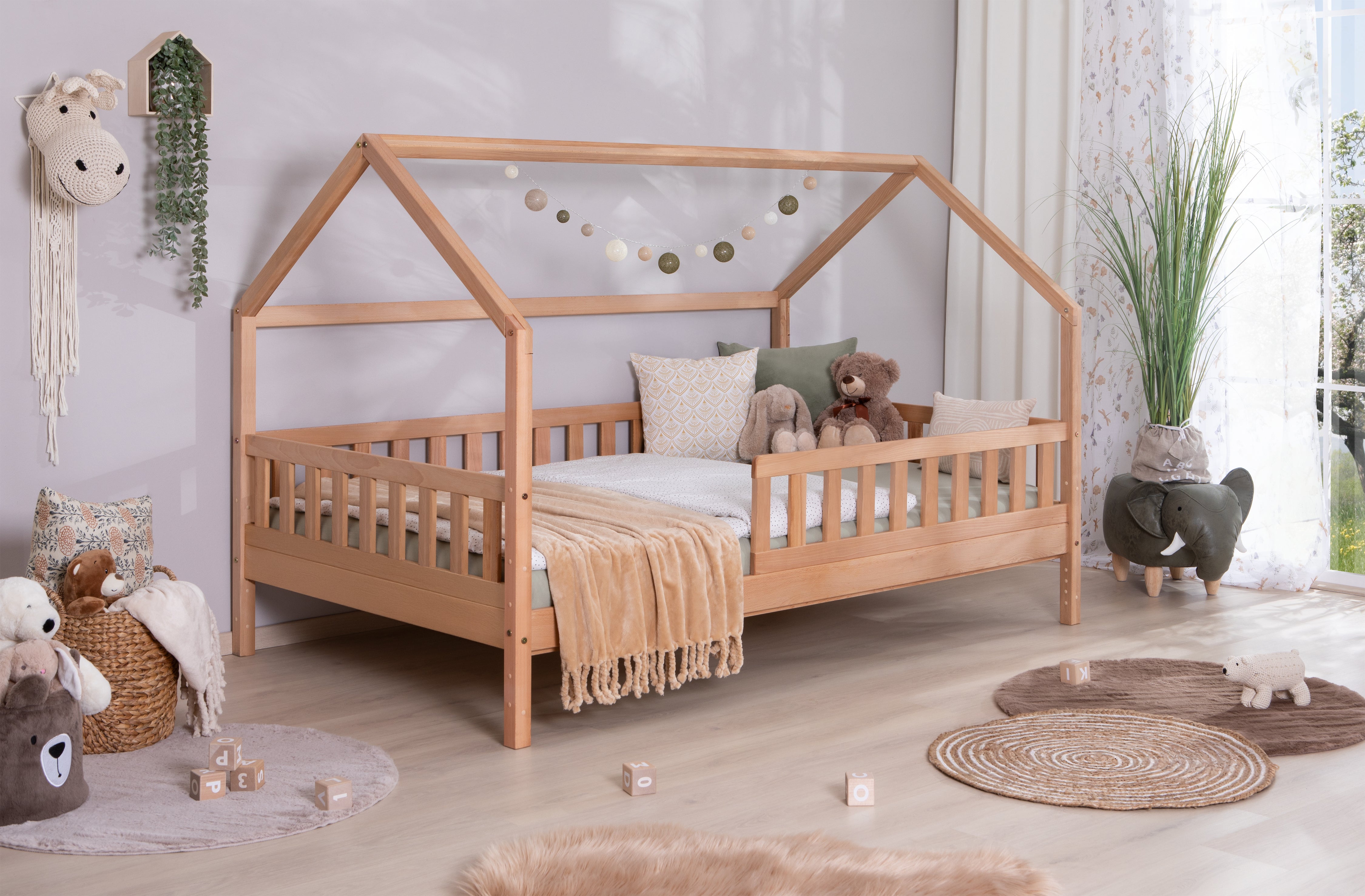 Dank der durchdachten Konstruktion lässt sich das Dach des Bettes bei Bedarf abnehmen, und auch der Rausfallschutz ist flexibel montierbar. Ob als Schlafplatz für Kleinkinder oder später als Jugendbett – das Duo bleibt über Jahre hinweg ein treuer Begleiter.