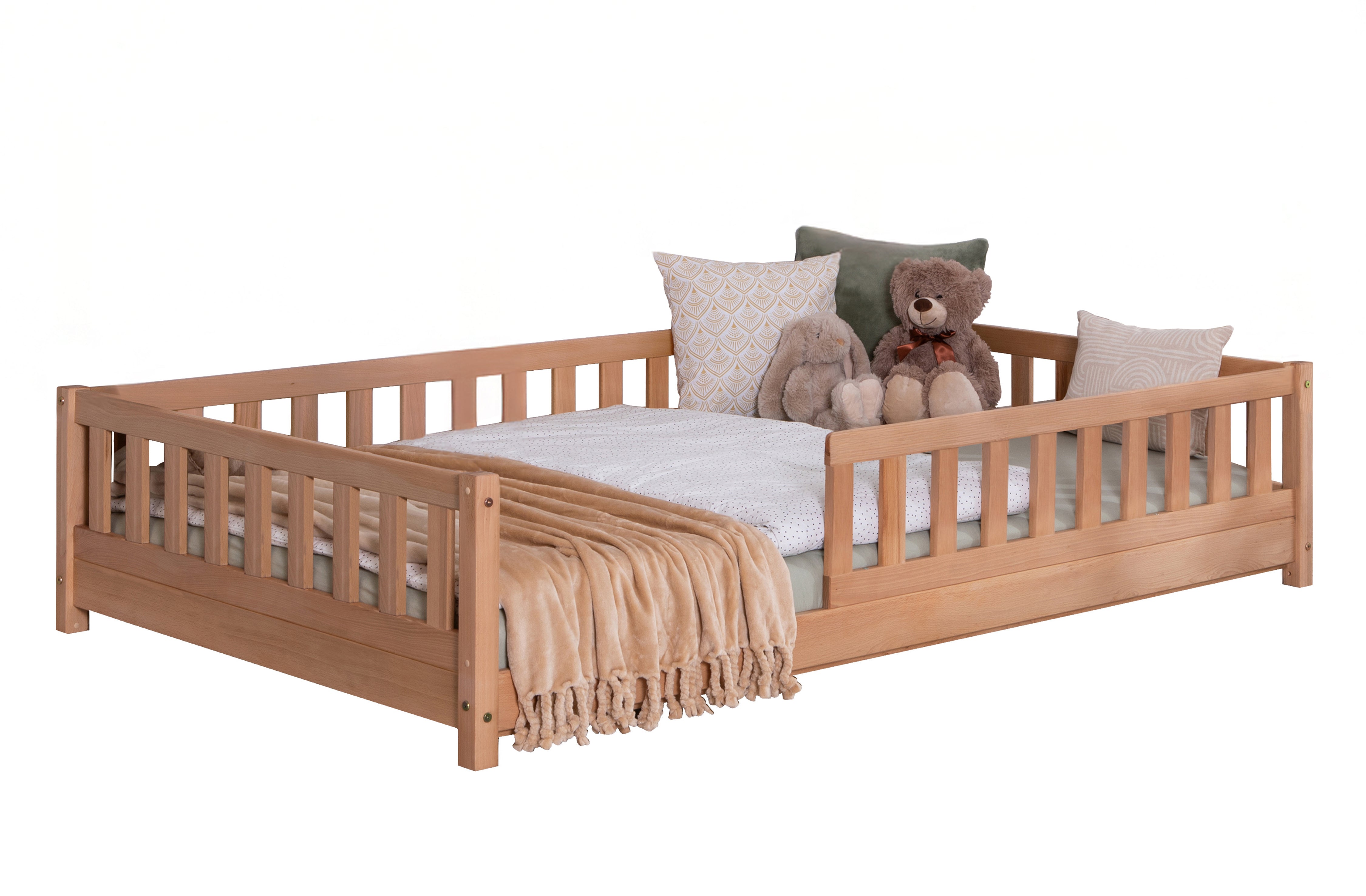 Das Bodenbett Mio in der Größe 120x200 cm aus massivem Buchenholz bietet eine bodennahe Schlaflösung, die perfekt auf die Bedürfnisse von Kleinkindern und Kindern abgestimmt ist. Dank seines Montessori-inspirierten Designs können selbst die Kleinsten eigenständig ins Bett klettern oder daraus heraussteigen – ideal zur Förderung der Selbstständigkeit. Mit einer höhenverstellbaren Liegefläche und einem abnehmbaren Rausfallschutz (wahlweise rechts oder links montierbar) passt sich das Kinderbett flexibel an die Entwicklung deines Kindes an und bietet maximale Sicherheit dank abgerundeter Kanten.