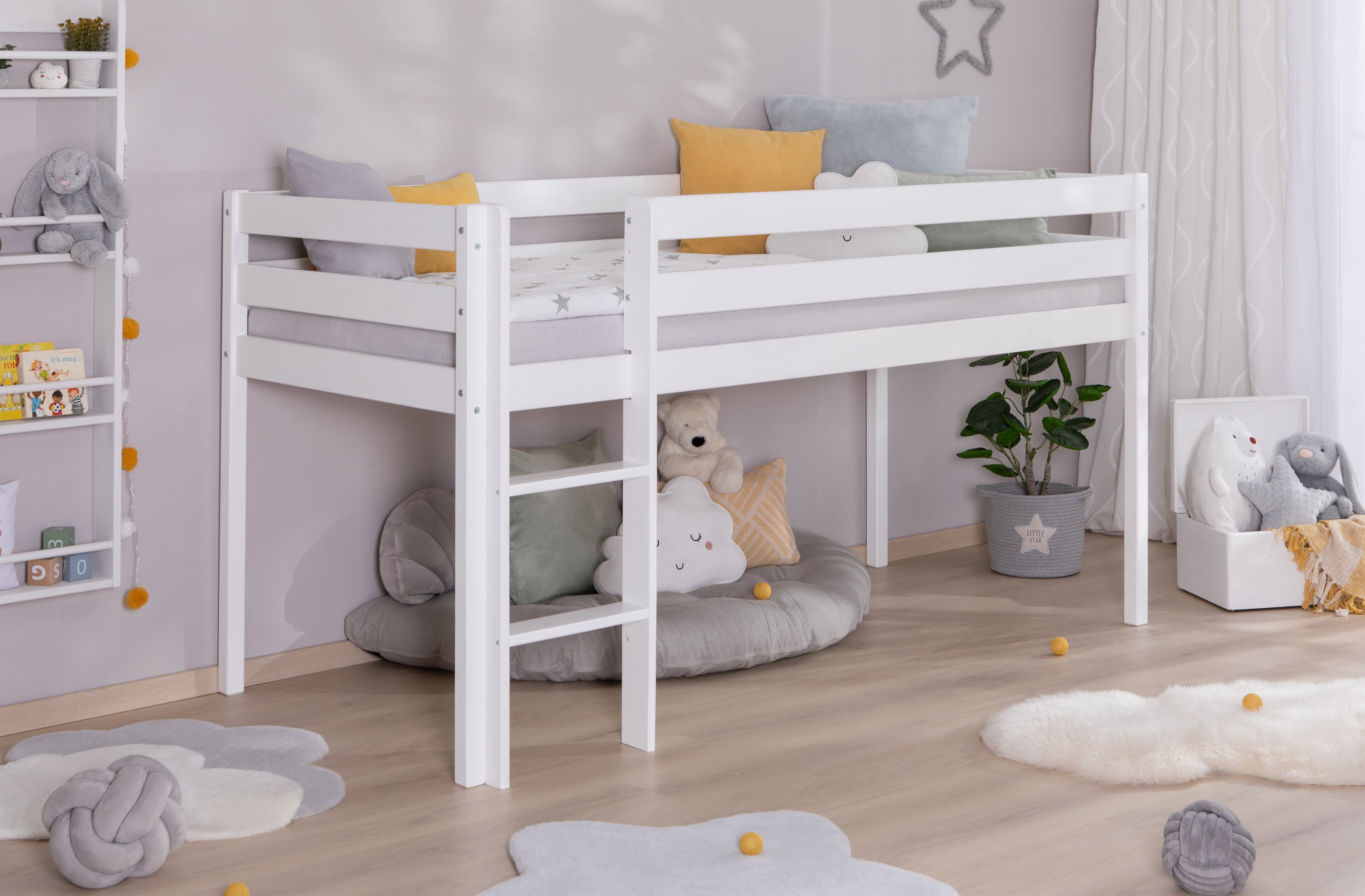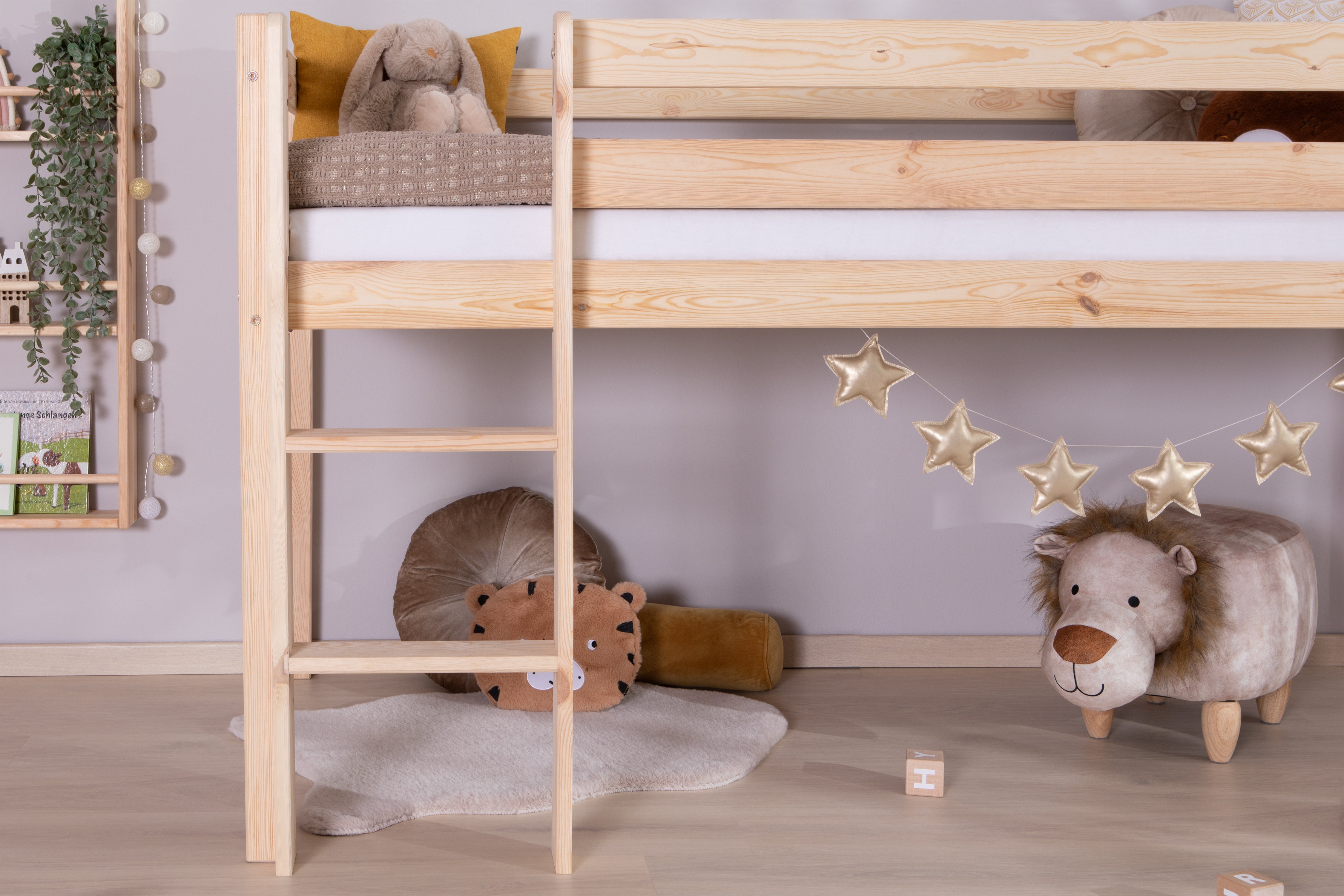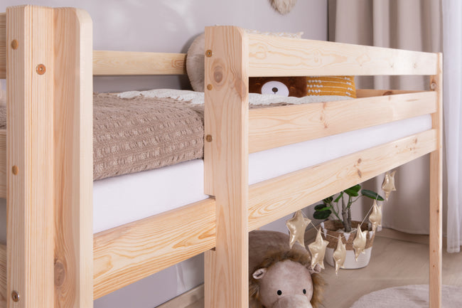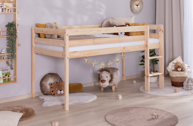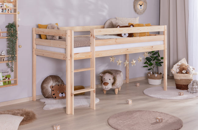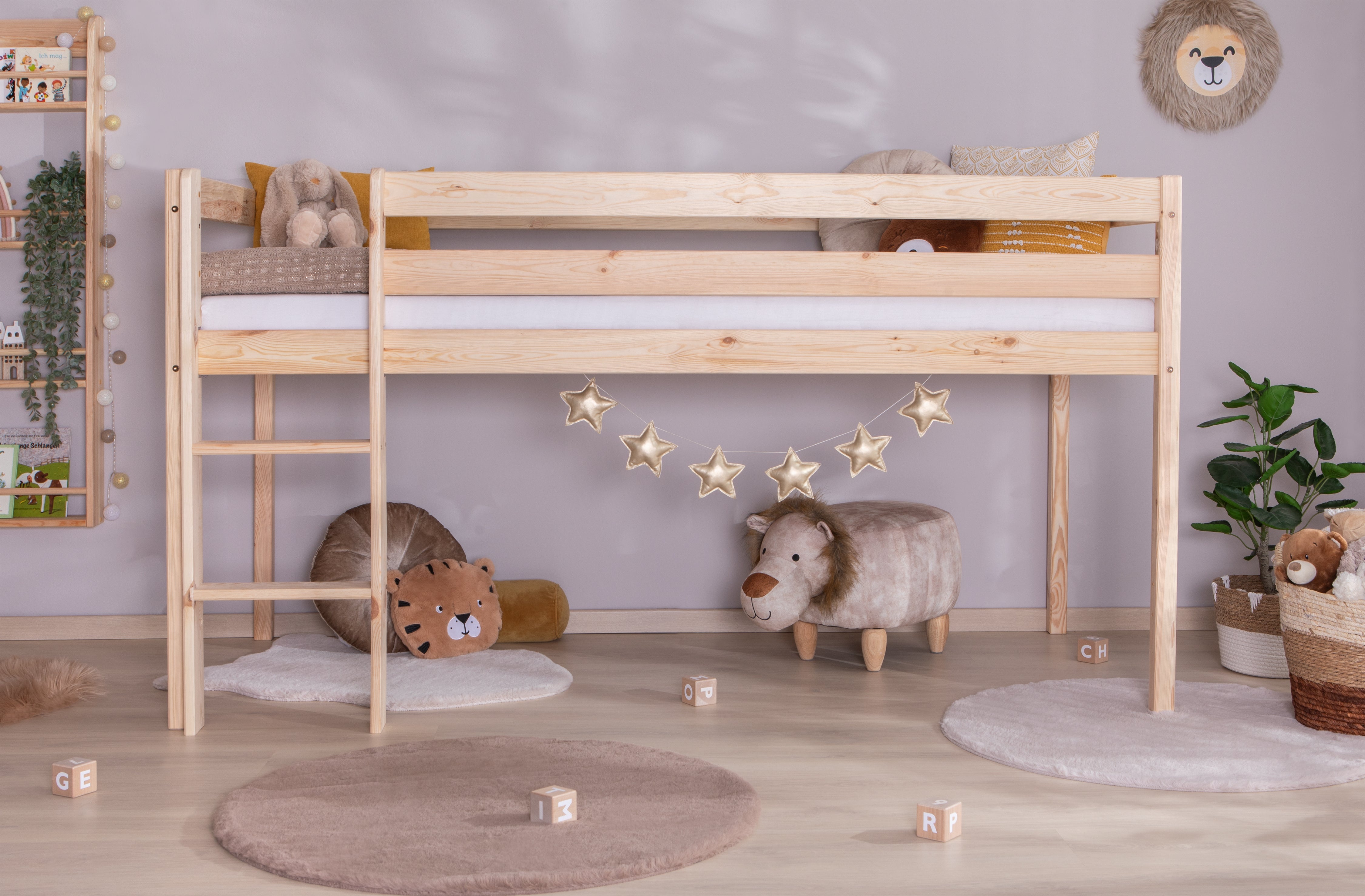 Das Hochbett Malte in 90x200 cm aus massivem Kiefernholz ist seit Jahren ein Liebling in vielen Kinderzimmern – vielleicht auch bald bei euch! Mit seiner kompakten Bauweise und der niedrigen Höhe von nur 114 cm sparst du Platz und schaffst gleichzeitig ein kleines Schlafparadies. Zusätzlich geben dir die abgerundeten Kanten ein sicheres Gefühl, während dein Kind schläft oder spielt. Besonders praktisch: Du kannst die Leiter links oder rechts montieren, je nachdem, wie es am besten in dein Kinderzimmer passt.