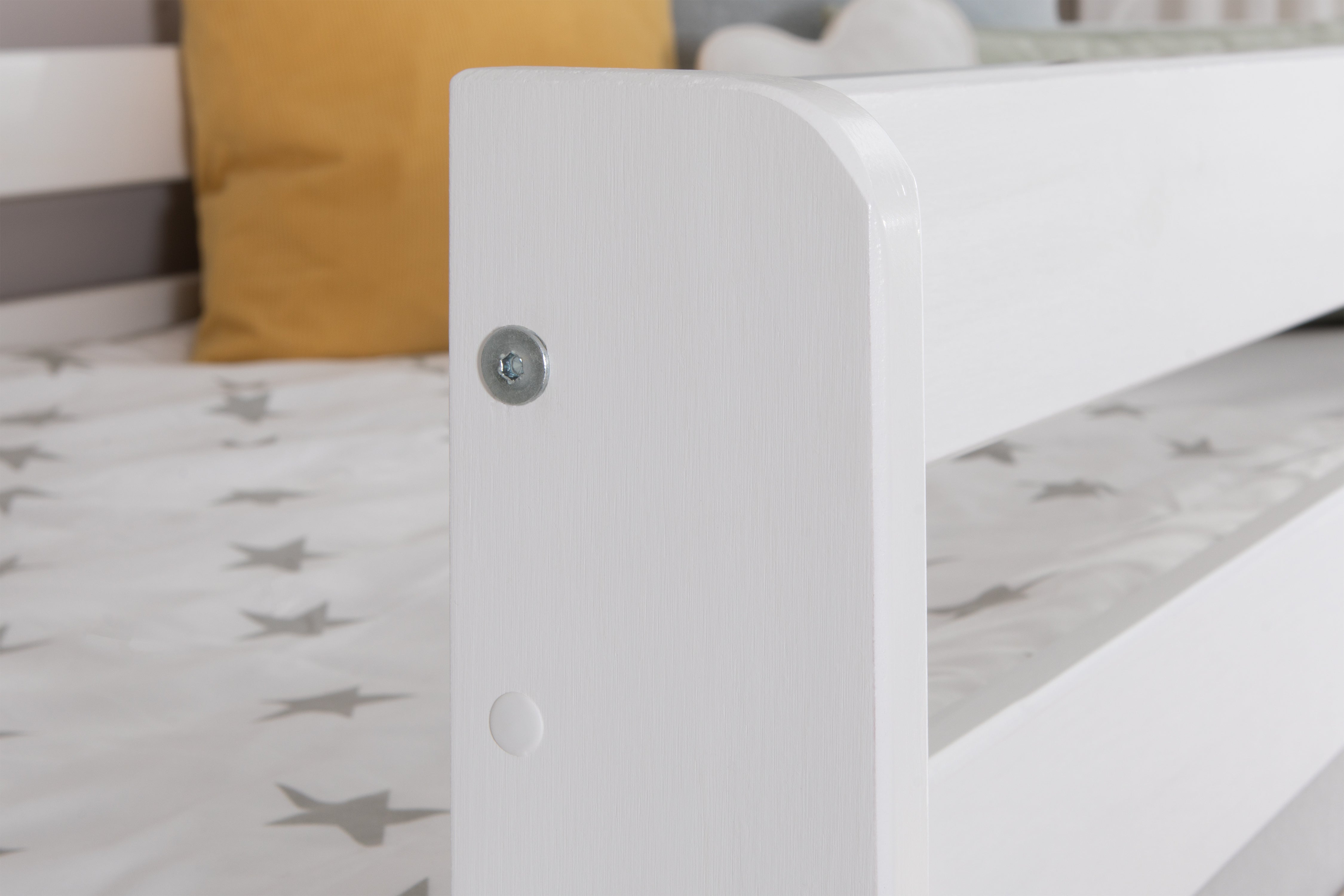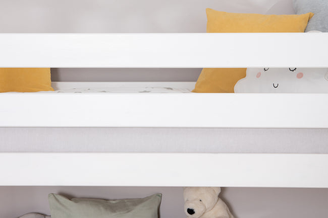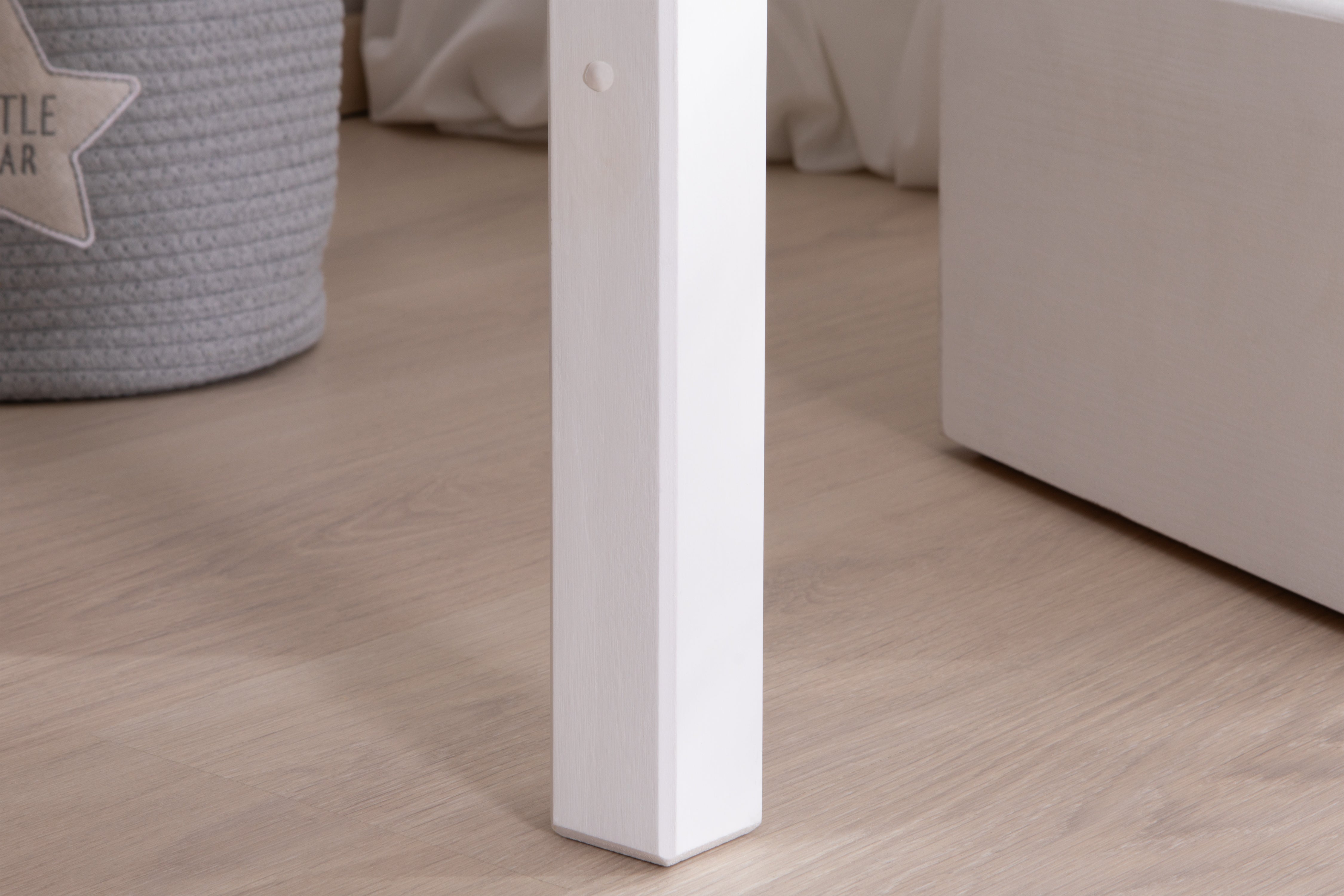 Für das Hochbett Malte in Weiß wurde ein wasserbasierter, geruchsarmer Lack verwendet. So bleibt die schöne Maserung sichtbar und du trägt zu einem angenehmen Raumklima im Kinderzimmer bei. Die naturbelassene Ausführung kommt ohne zusätzliche Oberflächenbehandlung aus und hebt die warme Maserung der Kiefer hervor. Qualität „Made in Europa“ steht für: Sicherheit, natürliche Produkte und hochwertige Verarbeitung.