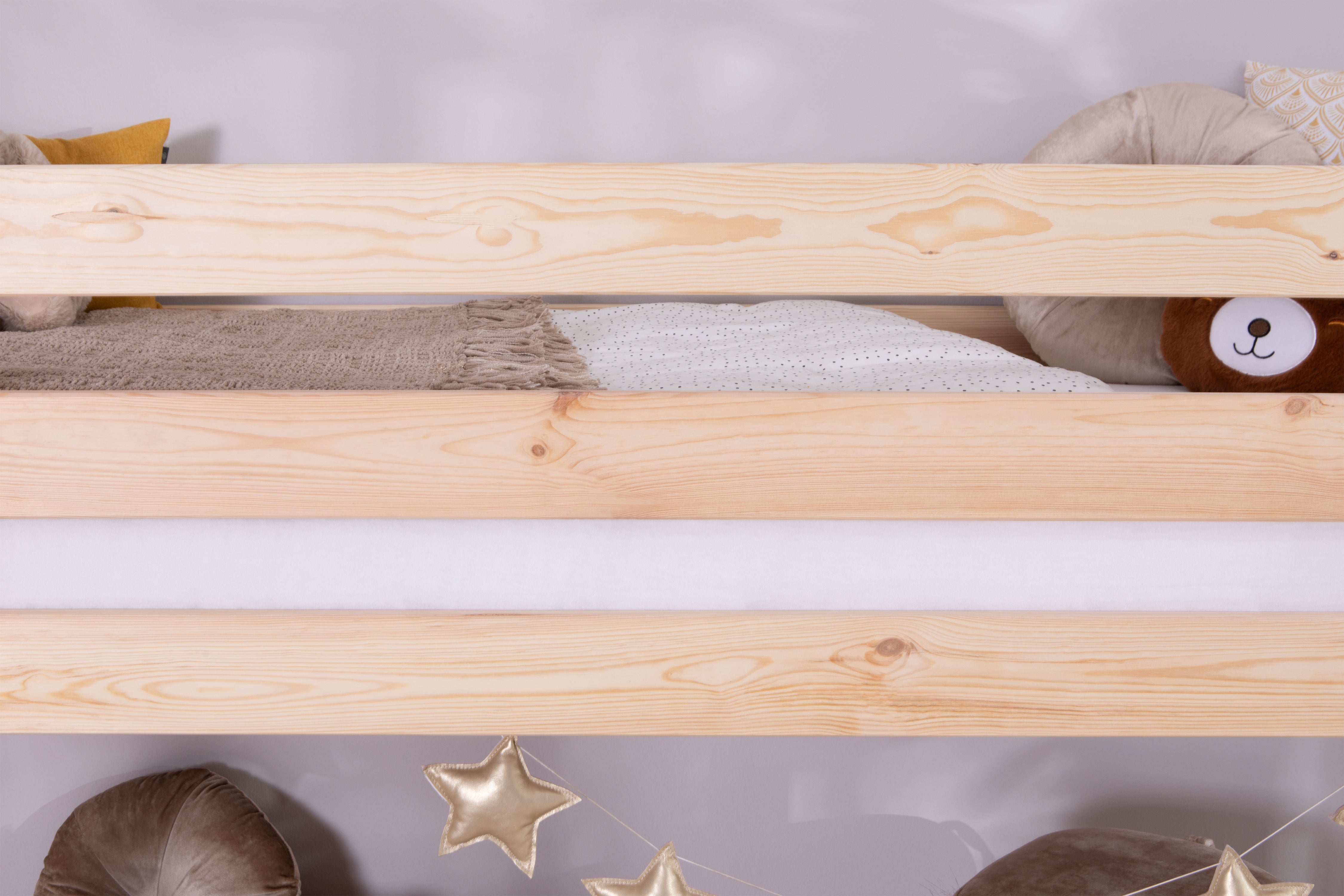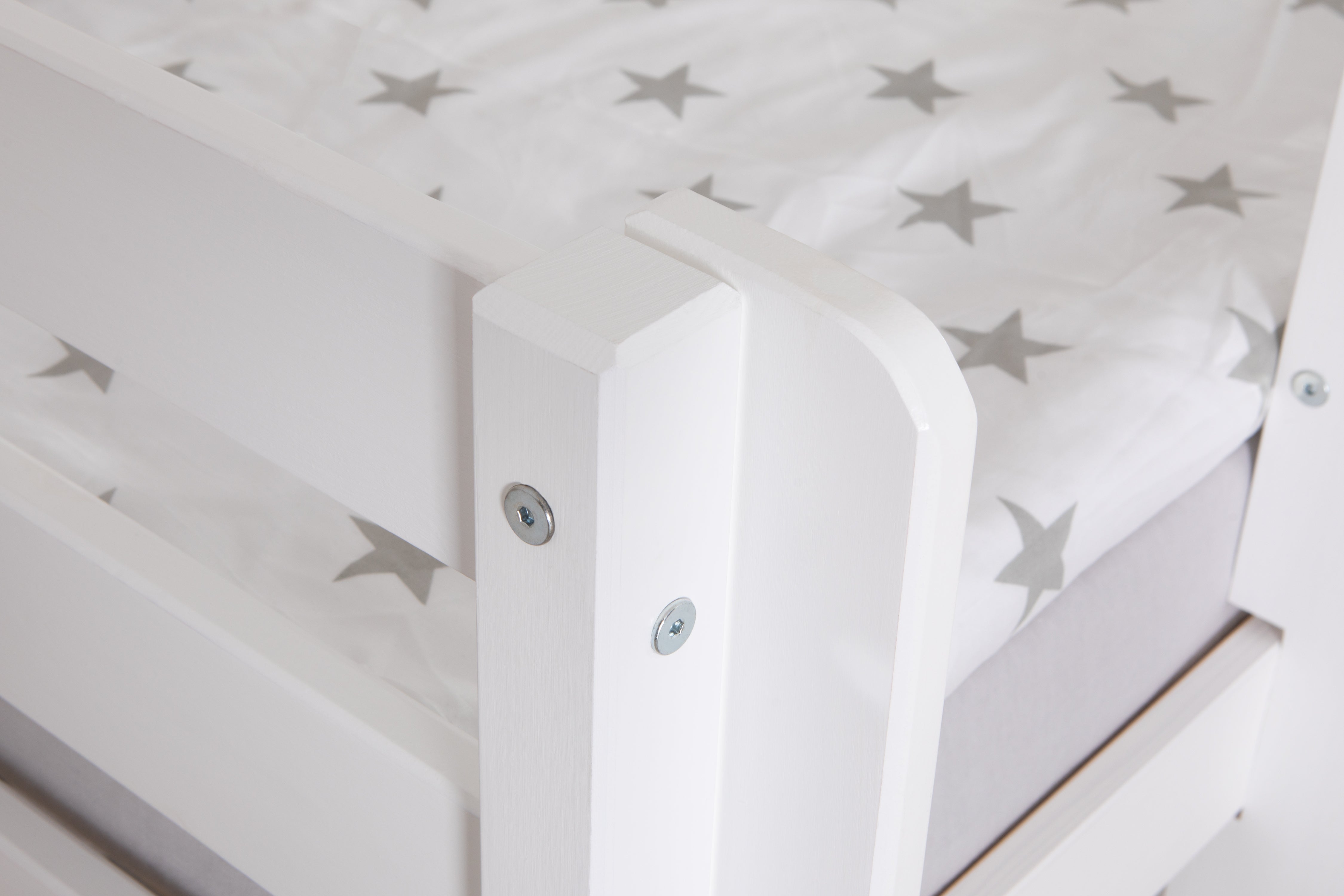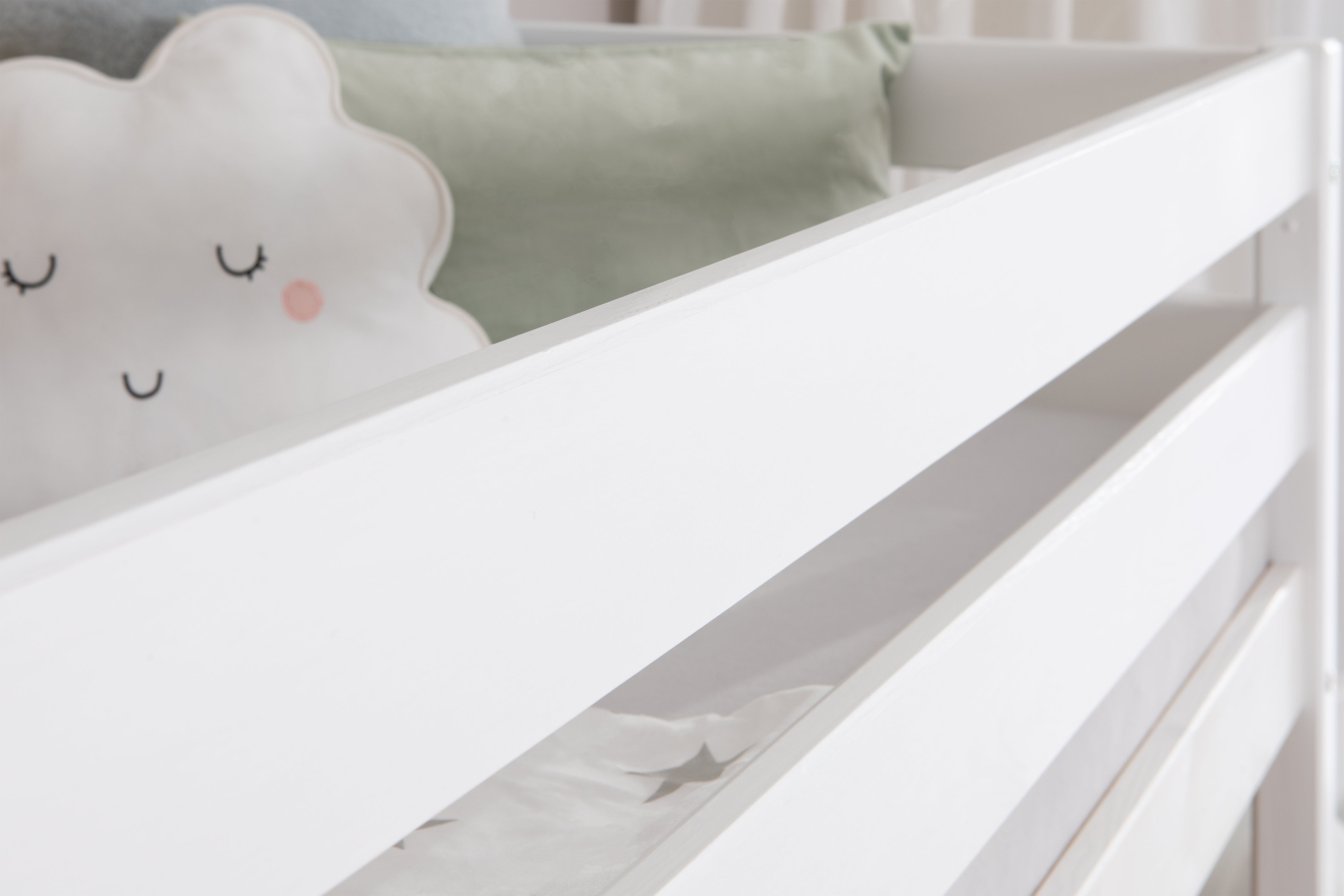 Für das Hochbett Malte in Weiß wurde ein wasserbasierter, geruchsarmer Lack verwendet. So bleibt die schöne Maserung sichtbar und du trägt zu einem angenehmen Raumklima im Kinderzimmer bei. Die naturbelassene Ausführung kommt ohne zusätzliche Oberflächenbehandlung aus und hebt die warme Maserung der Kiefer hervor. Qualität „Made in Europa“ steht für: Sicherheit, natürliche Produkte und hochwertige Verarbeitung.